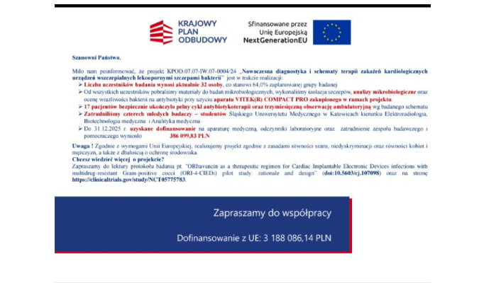 Miło nam poinformować, że projekt KPOD.07.07-IW.07-0004/24 „Nowoczesna diagnostyka i schematy terapii zakażeń kardiologicznych urządzeń wszczepialnych lekoopornymi szczepami bakterii” jest w trakcie realizacji: